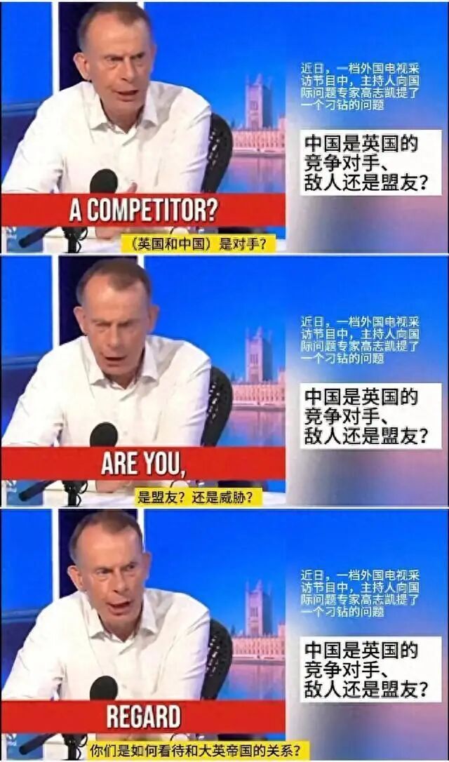 LBC记者安德鲁·马尔,曾经连线我国高志凯教授,一开始他提出了一个问题,说:你觉得英国是中国的竞争对手?盟友还是威胁?