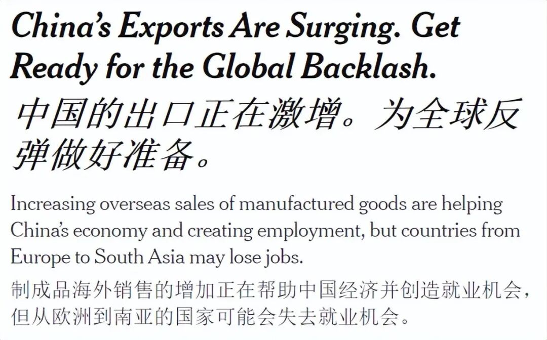 当然,最让他们崩溃的,还有出口数据。如果翻阅纽约时报前些年关于中国的报道,感觉中国早就来来回回崩溃好几次了,结果呢?先绷不住的是他们自己,尤其是在报道中国今年前两月的进出口情况时,十分绝望,说是中国抢了他们的饭碗。