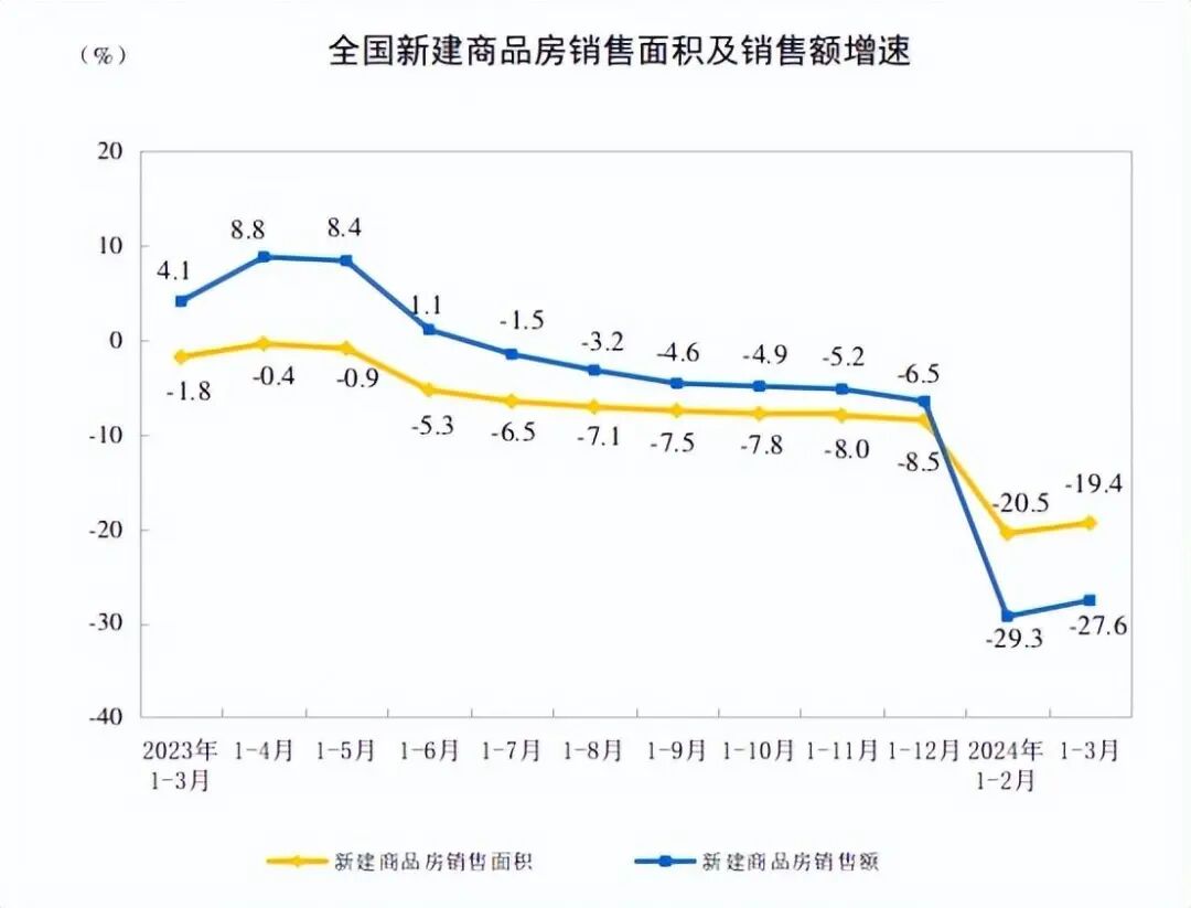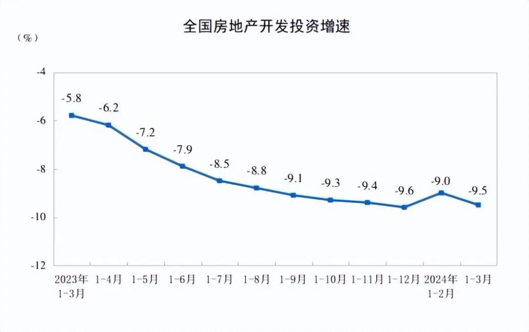 根据国家统计局公布的数据显示,中国第一季度房地产开发投资同比下降9.5%,其中住宅投资下降10.5%;
