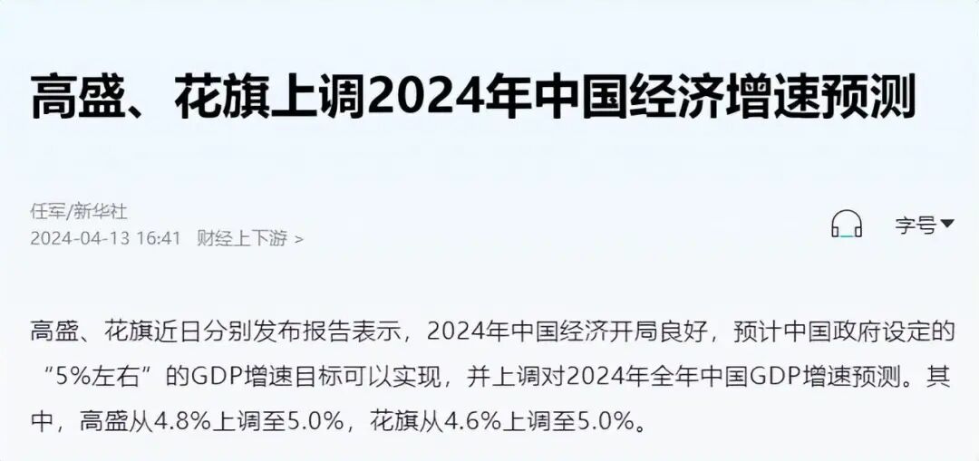 高盛,上调了对今年中国经济增长的预期,从GDP增长4.8%,上调到5.0%;
