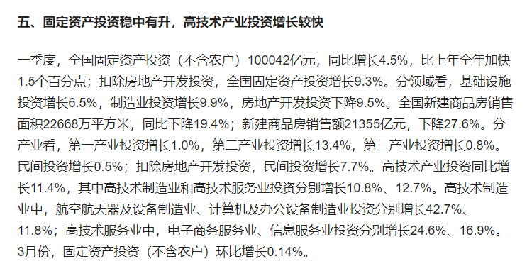 高技术产业尤其值得一说,高技术制造业增加值增长7.5%,相比去年四季度加快了2.6%。不仅如此,高技术产业投资同比增加了11.4%,其中航空航天器及设备制造业投资增长42.7%;计算机及办公设备制造业投资增长11.8%;电子商务服务业投资增长24.6%;信息服务业投资增长16.9%。不都说中国制造业被转移到印度、越南了吗?咋增长还这么猛?关键是还在不断产业升级!这又要让欧美失望了。