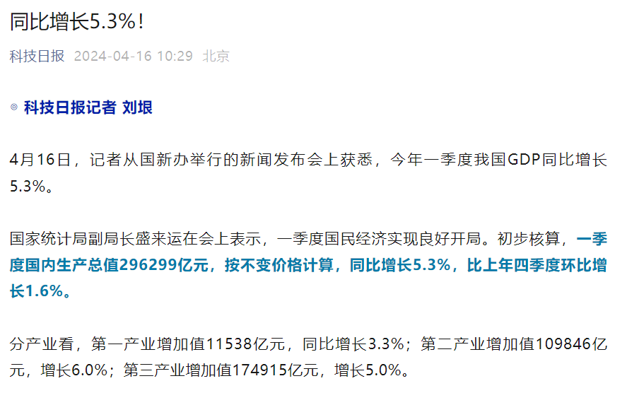 但这毕竟还只是上调预期。这不,现实直接对他们贴脸输出了。中国最近也公布了2024年一季度GDP,结果就是同比增长5.3%,比上年四季度环比增长1.6%,要知道一季度可是过了个春节,竟然环比也能这么多,是真的狠!