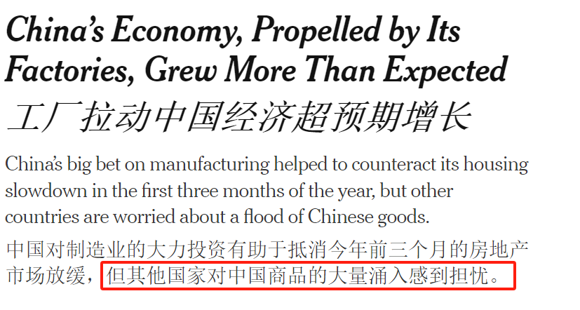 当然,更多的是陈述中国经济增速惊人的同时,还酸不拉唧地挑刺,比如,嘴硬王者纽约时报,在报道时,还得加上一段“但其他国家对中国商品的大量涌入感到担忧。”