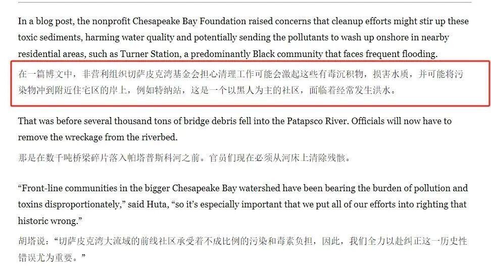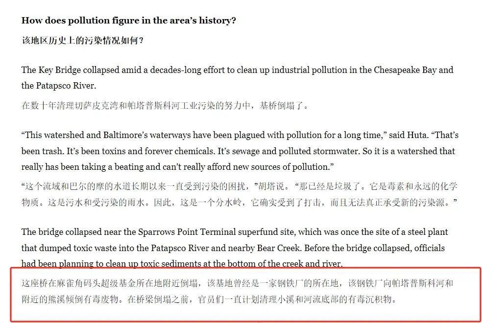 而且,民主党对环保非常重视,所以清理大桥残骸和重建工作,也要经过环境许可程序。这个我真的是要说几句,就是清理大桥残骸的时候,非营利组织切萨皮克湾基金会表达了担心,担心啥呢?别看欧美天天喊着环保、环保,实际上, 他们在发展的时候,是极其不重视环保,这个港口附近,曾经有个伯利恒钢铁厂,他们直接将有毒废料,倒到了帕塔普斯科河和附近溪流,这几条河流向了切萨皮克湾,也就是巴尔的摩大桥所在地,有毒物质就在这沉降,这么多年了,在海床里也稳定了。现在你一清理河道,那有毒沉积物不就又进到海里面了嘛,那海里的鱼怎么办,海里的虾怎么办,海里的泥鳅怎么办,哦,海里没有泥鳅。
