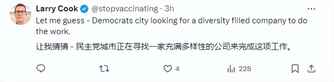 但是美国网友并不买账,有人表示,马里兰州是蓝州,是民主党的基本盘之一,民主党一定会找一家充满多样性的公司来完成这项工作,也就是雇佣黑人、跨性别者、LGTB+群体的公司。
