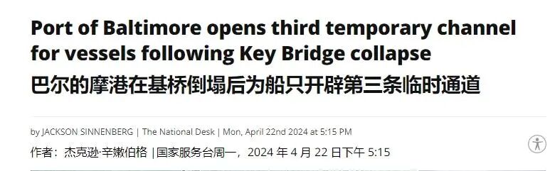 结果呢,现在距离事故都已经1个月了,船还没挪走呢,港口还没恢复正常呢。虽然4月19日,巴尔的摩港官员表示,开通第3条临时通道,但是,这个临时通道深6.1米,水平间隙91.4米,垂直间隙41.2米,但是这条通道只能满足大约15%的商业活动,大船还是走不了,还是要快点挪走这个挡路的船才行。