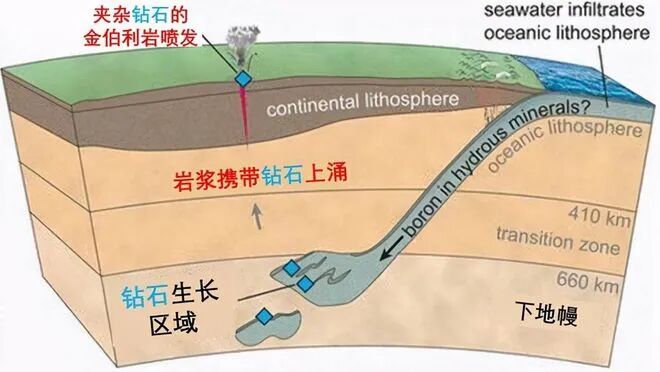 钻石形成之后,按理说难以到达地球表面,但是不要忘记火山会将地球内部的岩浆上涌到地球表面,携带着钻石的岩浆就这样来到了地表,目前我们开采的所有钻石矿井,曾经都发生过火山喷发。