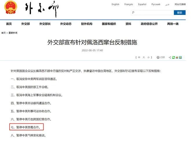近日,外交部宣布针对佩洛西窜台反制措施,一共有八项。其中一项是暂停中美禁毒合作,很多人不太明白这一项到底意味着什么?