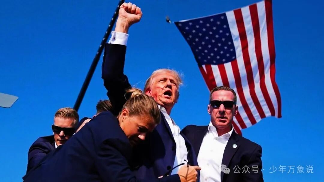 当时台上“懂王”正侃侃而谈,突然一声枪响,鲜血染红了他的半边脸。