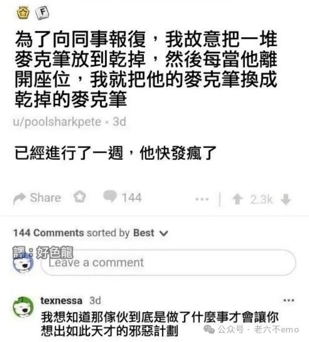 同事一女汉子,总喜欢奴役一新来瘦小男同事,男同事一直敢怒不敢言,晚上加班,女汉子让他去给买两个汉堡,回来女汉子正巧不在,我看不过去了,偷偷把吃剩的半管芥末,挤在汉堡里,结果女汉子一边流着泪,一边暴打男同事,我默默地忏悔了。。。