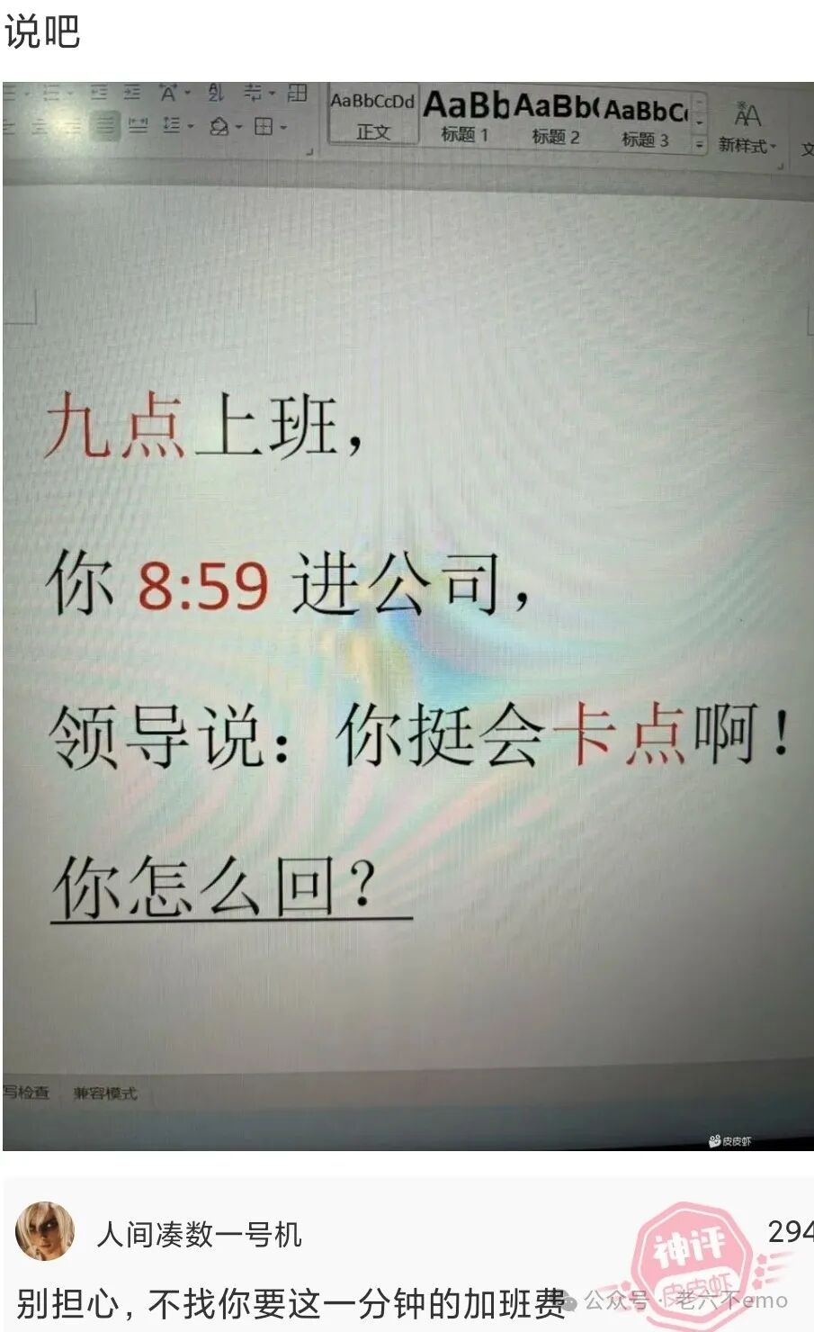 一大妈背一筐蜂窝煤从公交车后门上车,艰难的放好后,正往前刷卡,司机却不耐烦的喊道:后面上的到前面刷卡。大妈也不高兴了:今天我就不刷卡……司机语带愠怒:不刷就下车。眼看就要起一场纷争,大妈提高声音说:今天我就不刷卡,我投币。司机语塞,全车人哈哈大笑。
