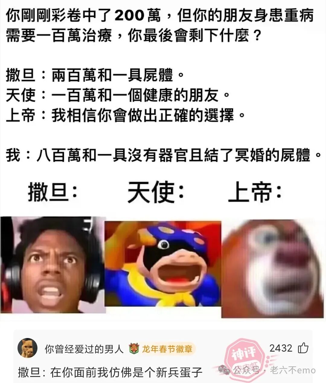 小区附近新开了一个浴室,装修高档,连大池的水里都装上了壁灯,楼主脱了衣服刚要下水,里面十几个泡澡的兄弟忽然站起喊着各种号子,集体跳起舞来,楼主被这种欢迎场面逗的哈哈大笑。忽然浴室老板慌慌张张的跑了进来,迅速拉下了电闸,黑暗中听见他说了句:“操!水灯漏电了!”啥?。。。