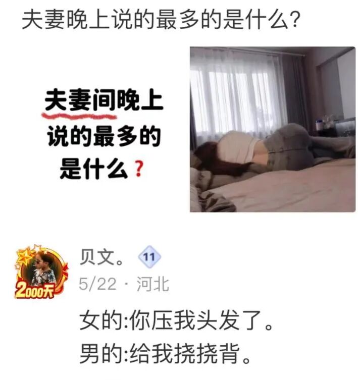 一对小夫妻洞房之夜第二天早上,小媳妇手指被竹篮扎了根刺,小伙子拿着针帮媳妇拔刺,小伙子很关心的问:“痛不?”媳妇说:“好疼。”这时在厨房的婆婆插话,:“第一次正常的。”小伙子回答说:“妈,我拔刺呢。”婆婆说:“八次不算厉害,当年你爹一晚上13次呢。”