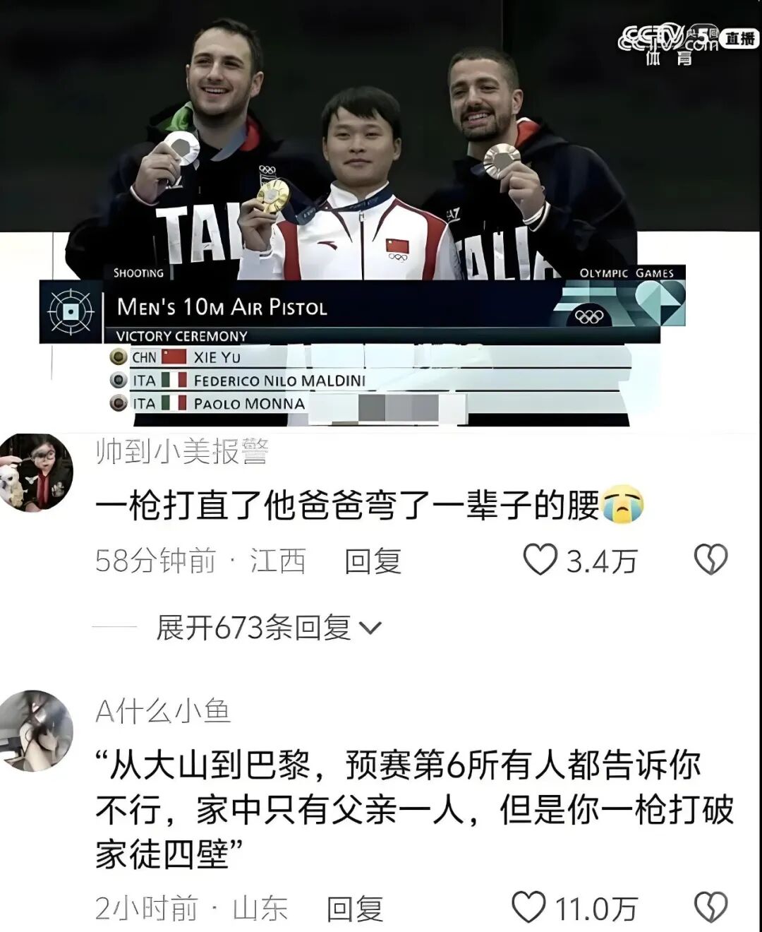 神回复:巴黎奥运会射击冠军谢瑜,一枪打直了他爸爸弯了一辈子的腰~