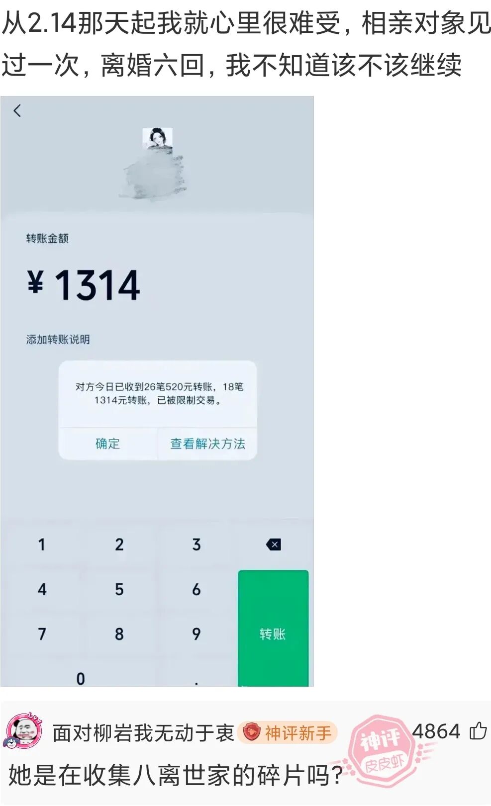 神回复:相亲对象见过一次,离婚六回,我不知道该不该继续?