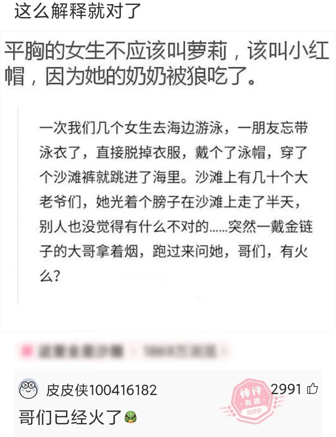 神回复:平胸的女生不应该叫萝莉,该叫小红帽,因为她的奶奶被狼吃了~