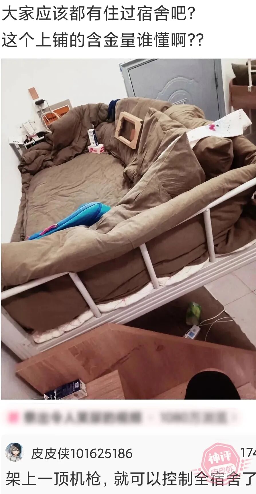 神回复:大家都应该有住过宿舍吧,这个上铺的含金量谁懂啊?