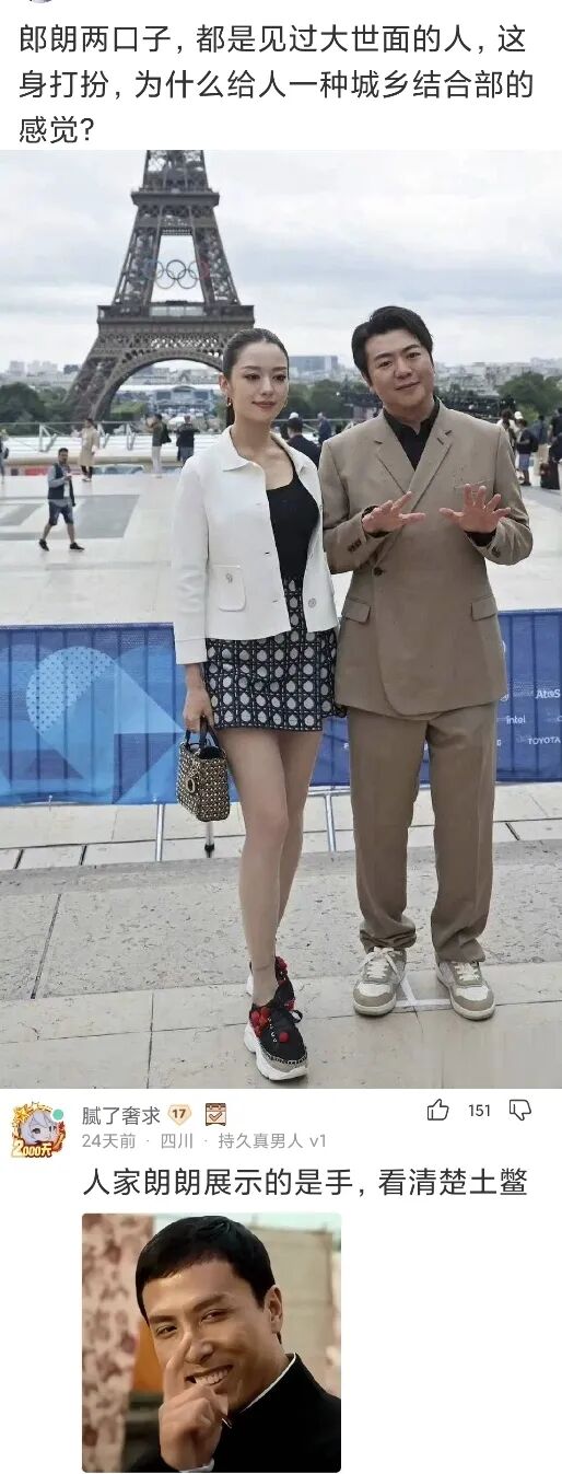 神回复:郎朗两口子,都是见过大世面的人,这身打扮,为什么给人一种城乡结合部的感觉?