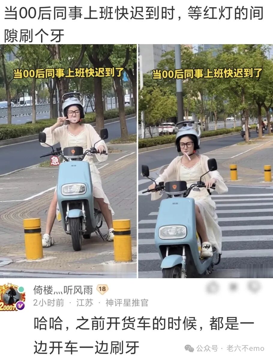 神回复:当00后同事上班快迟到时,等红灯的间隙刷个牙!