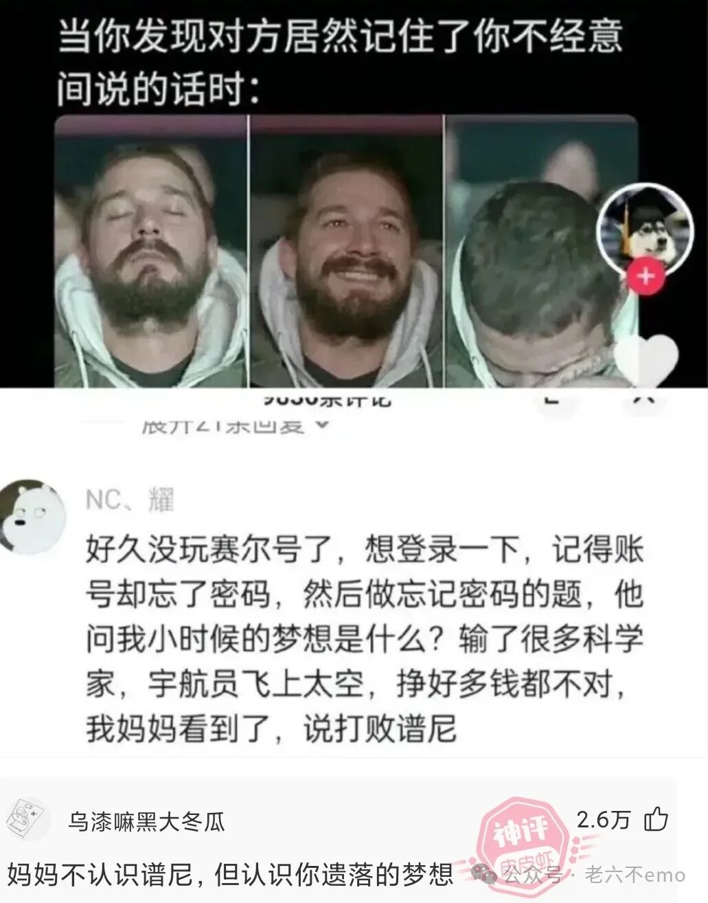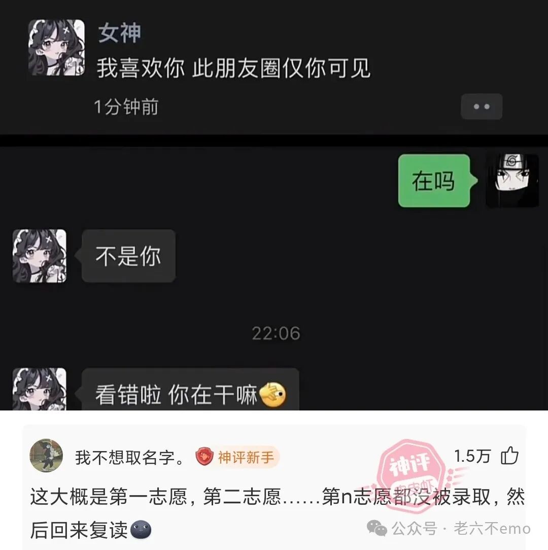 宿舍突然来了一位大妈。她扫视一圈,盯着我问:小伙子,你谈恋爱了吗?我告诉她没谈。大妈松了一口气。我纳闷了,就问:大妈你几个意思啊!大妈说:我女儿谈了个男朋友,说就是这个宿舍的,我来看看。我问:大妈,我们宿舍6个人,为啥就问我呢?大妈笑笑说:只要不是你我就放心了!