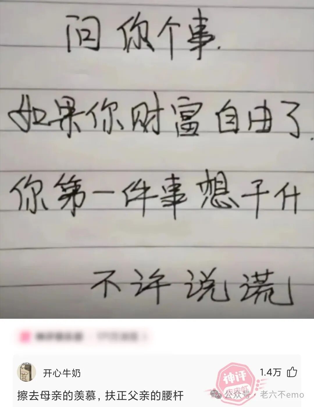 老师问在家里父母怎么督促学习的,同学们纷纷叫苦。老师问我,我轻声的说:“我妈会在厕所放复习题,她说我上厕所的时候才会想起看书。”老师问:“那你每天就看十来分钟书啊?”“怎么可能,她会在我的水里饭里下泻药。”我强忍着眼泪说。