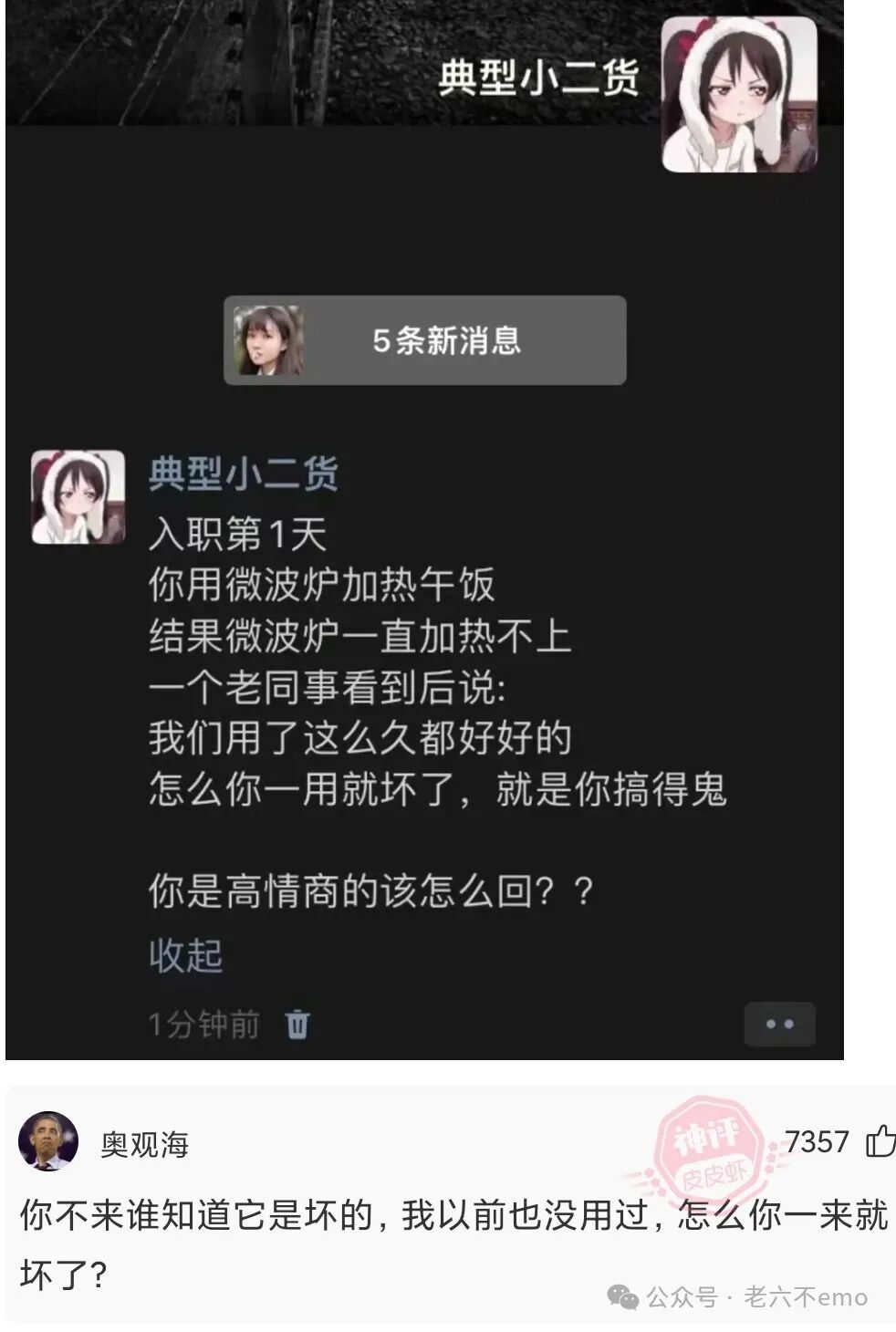 老爸叫我去街上买桶装鱼饲料,买完回家,我上了一辆公交车,由于很重,我就把桶放在过道上。一妹子上车,没座位,就坐在桶上。我到站了,于是我很礼貌地说:“姑娘你把屁股抬起来一下,我要桶。”只见那女的脸都绿了,说:“看起来斯斯文文的,没想到是流氓。”我要桶怎么了?我哪流氓了?