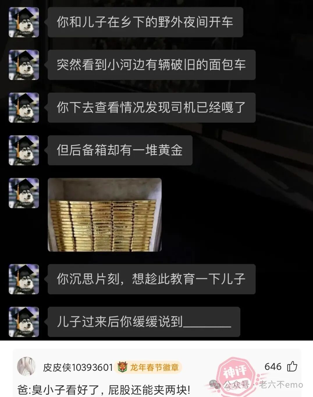 自从救了那只老猫,它每天都会来找她,嘴里叼着一只死老鼠。撞见老猫上气不接下气地追老鼠的情景后,她心疼地拦住它:已经够了,不要再报答我了!老猫似乎听懂了,默默离去…第二天,门口果然没有了老猫的踪影,倒是站着昨天逃掉的老鼠,手里捧着一颗花生。后来救了花生,第二天花生带了卷福来,姑娘放了卷福,第三天花生带了大舅来,放了大舅,大舅带着外甥们来,放了外甥,外甥带了女精灵队长来,放了女精灵,女精灵带了精灵王子来,放了王子,王子带了大王来,放了大王……姑娘说:你当我傻呢?!