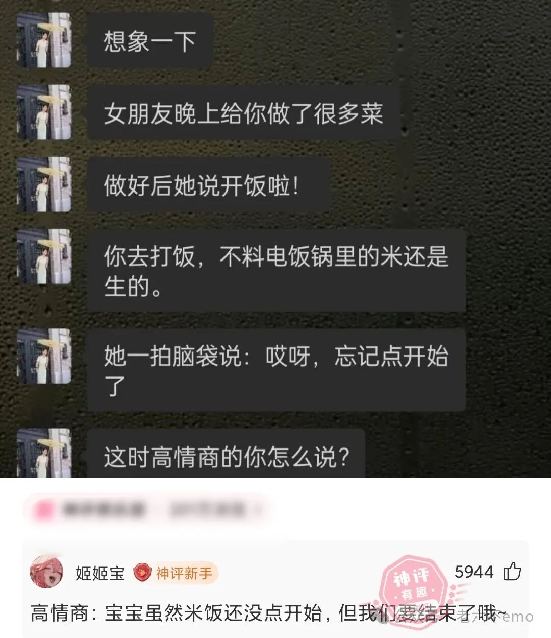 老婆生完儿子还在哺乳期那段时间,消耗大,特别容易饿。一次,老婆又饿了半夜爬起来找吃的,岳父给她下了锅面条,她全吃完了,拍了拍圆滚滚肚子,打着饱嗝说:“爸,你下得太多了,撑死我了。”岳父幽怨的说:“我也饿了,特意下了两个人的,还以为你会给我留点。”