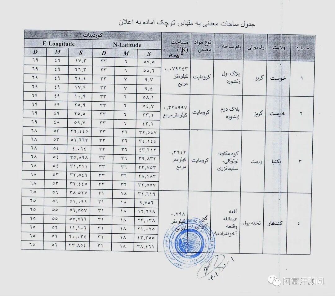星期二,阿富汗矿业和石油部公布了九个小规模矿招标公告。九个矿包括石膏、大理石和铬铁矿。如果需要详细了解,可与本公众号联系获得帮助。