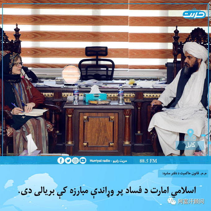 9月29日,联合国喀布尔法治办公室负责人莫妮卡·曼廷表示,伊斯兰酋长国在打击腐败方面取得了成功,并将腐败程度降至非常低的水平。 Mantin 夫人在与事务总局办公室主任 Qari Abdulwali Siddiqui 会面时发表了这些声明。