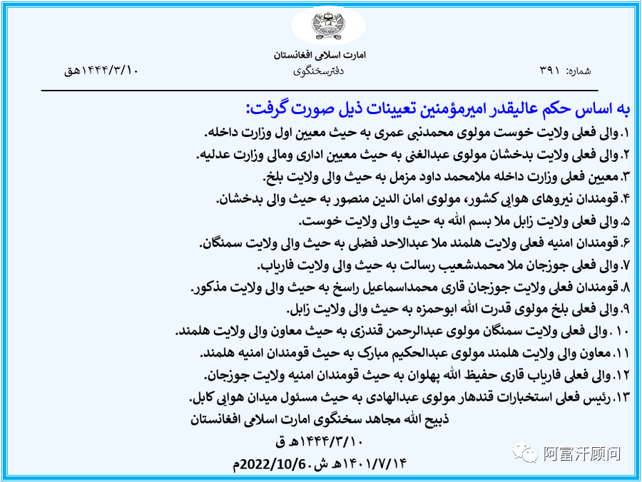 10月6日晚间,阿富汗当局政府发言人扎比胡拉的推特上公布了13名高级官员调整任命。