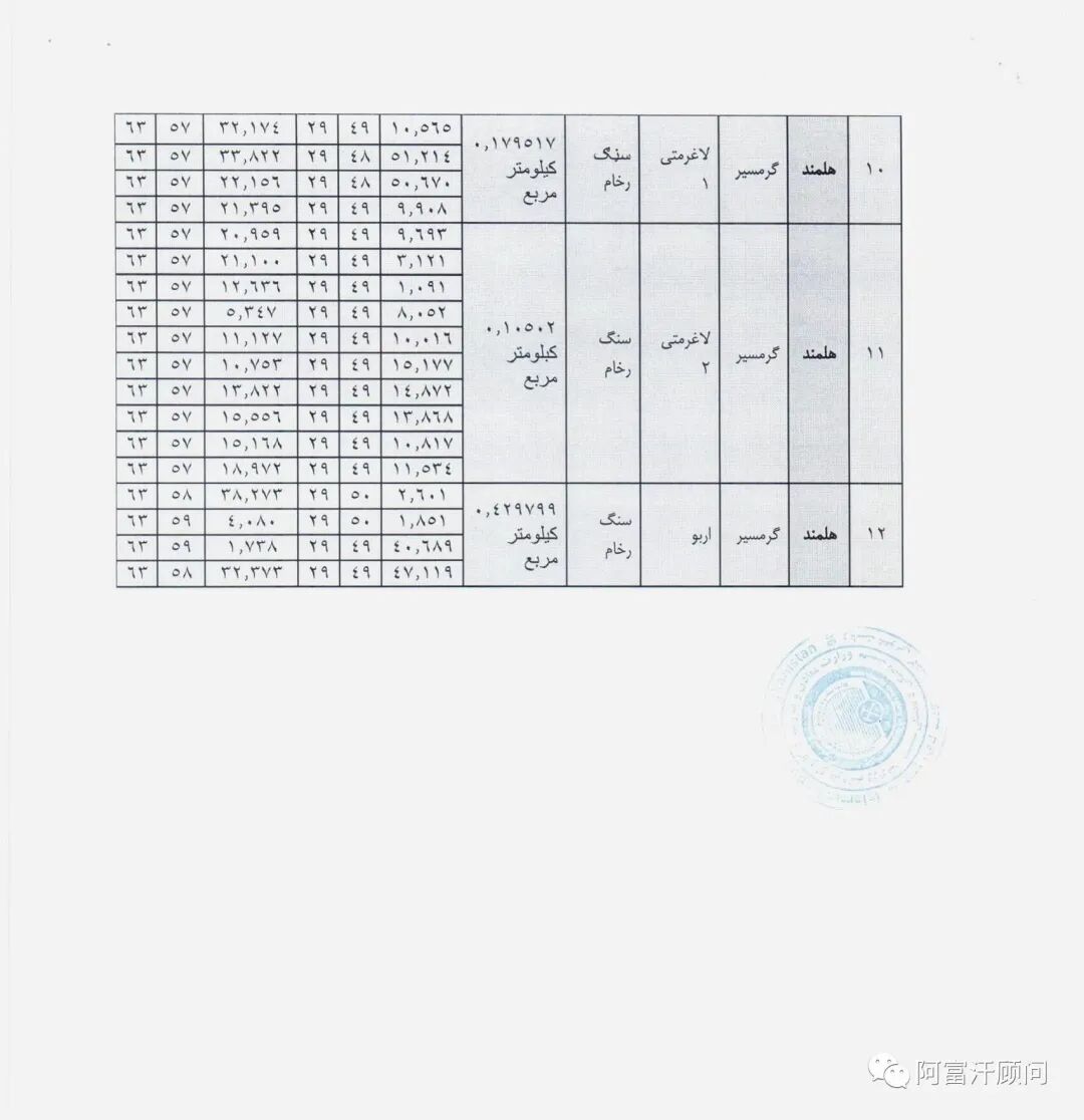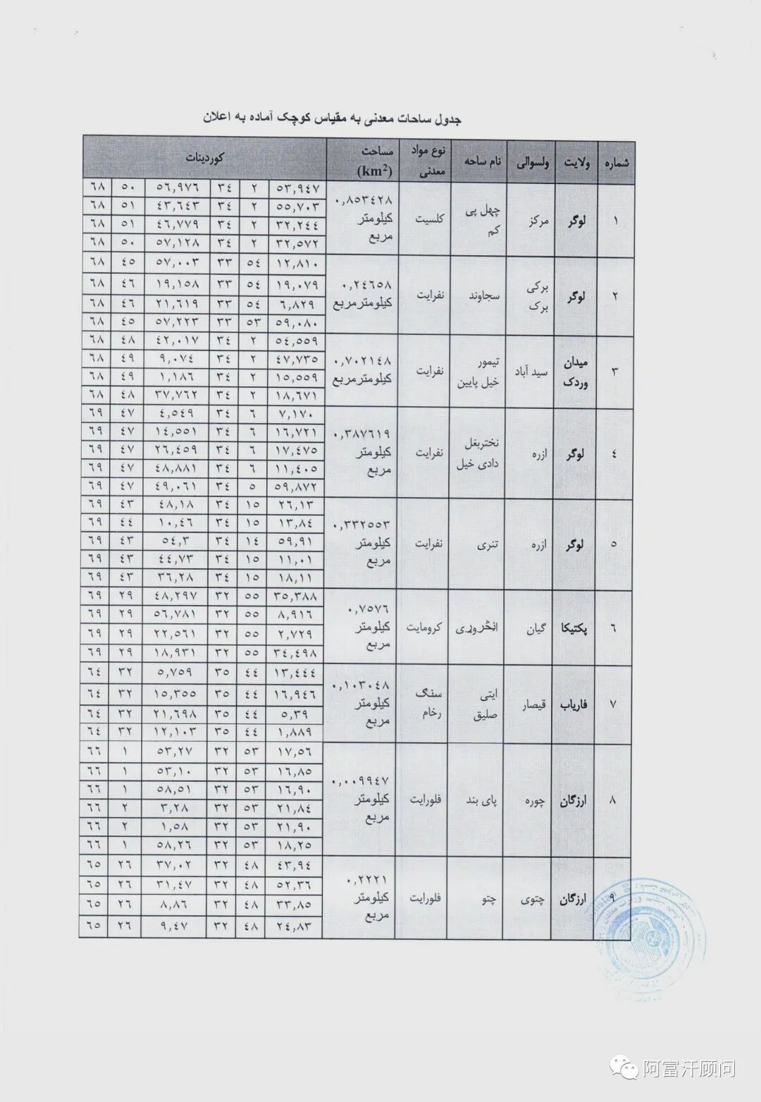 11月28日,阿富汗矿业和石油部宣布了 (12) 个位于 Logar、Maidan Wardak、Paktika、Faryab、Uruzgan 和 Helmand 省的小型矿区,供有关各方参考。有兴趣的人可以在 1401 年 9 月 9 日至 1401 年 10 月 8 日期间向矿产监管总局提交请求,在考虑条件后,他们可以获得合同以换取设定的价格。请注意,截止日期后将不再接受申请。