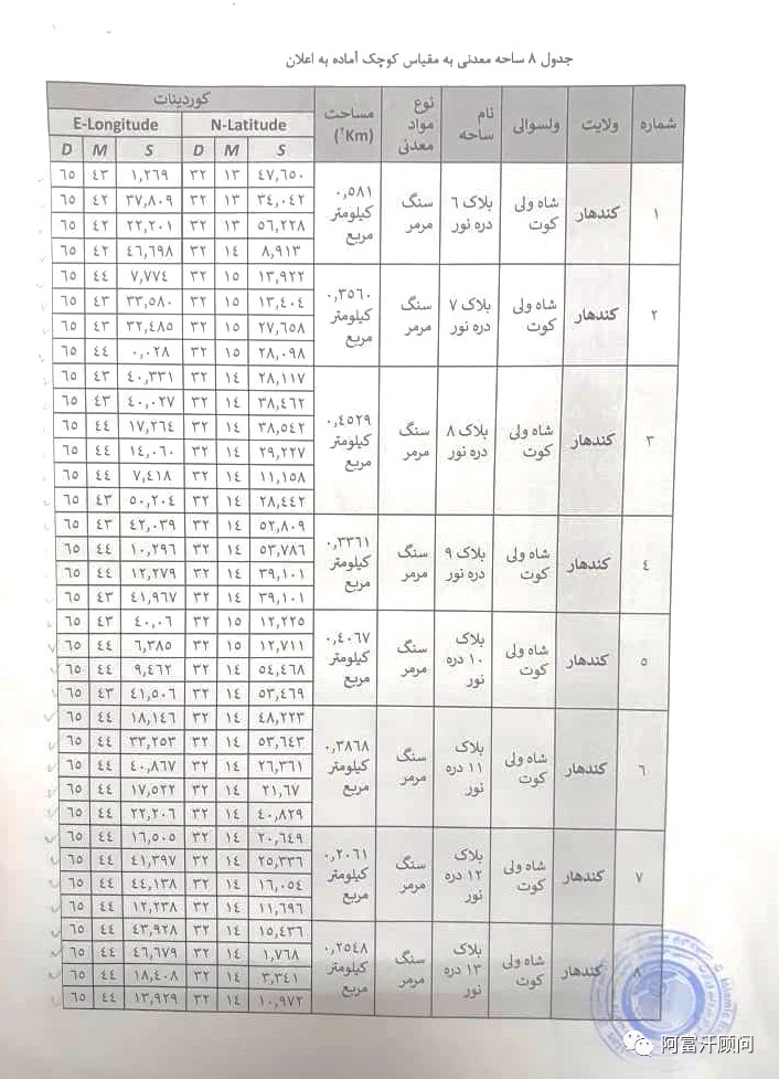 12月14日,阿富汗矿业部公布了坎大哈8个大理石矿招标。报名和提交申请资料的期限为一个月。