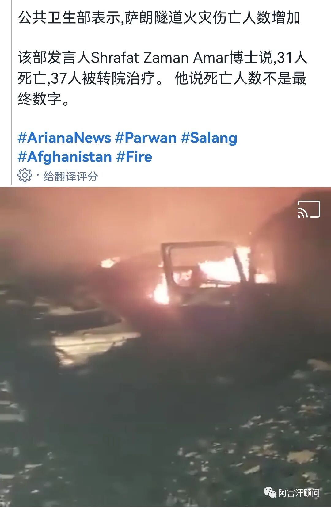 当局出动消防,卫生和国防部队参与救援。截止目前,阿富汗当地媒体报道称死亡人数已经达31人,另有37人受伤。