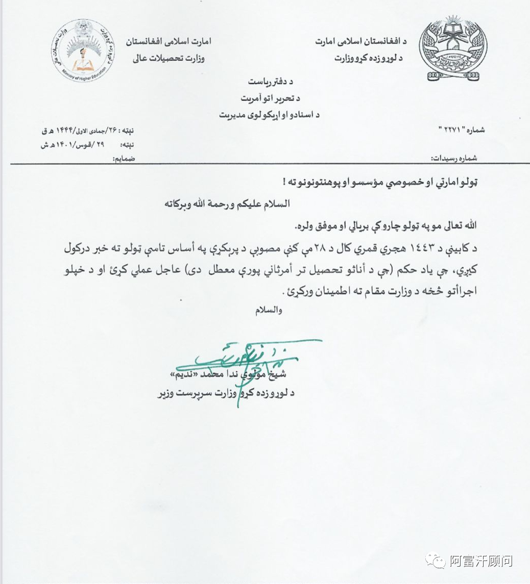 塔利班政府高等教育部代理部长内达·穆罕默德·纳迪姆(Neda Mohammad Nadeem)在12月20日公布的一封信中,命令全国所有私立和公立大学立即禁止妇女上课,直到进一步通知。阿富汗的女大学生们说,她们的学校已经通知她们从星期三开始停止上课。