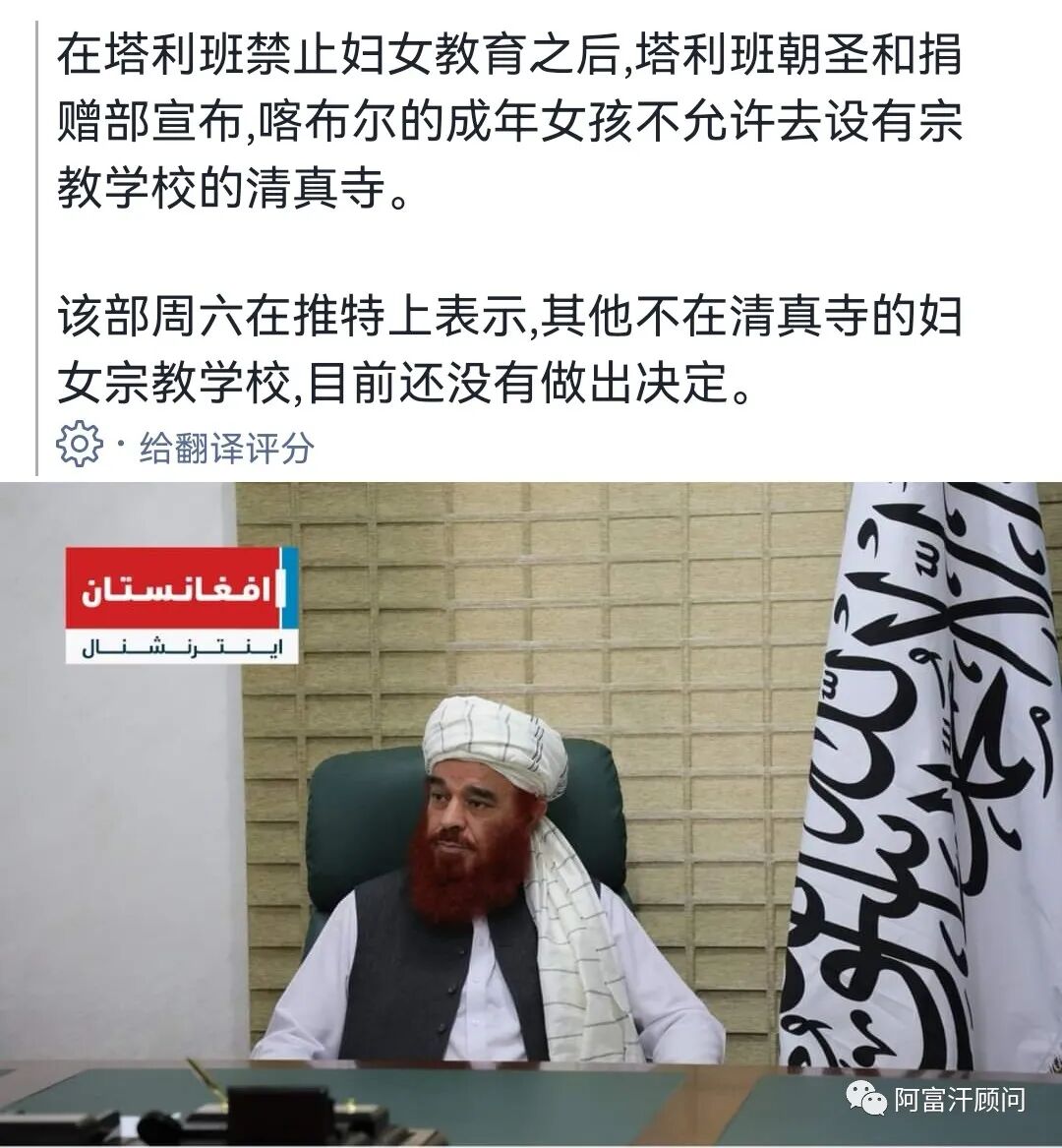 日前继高教部出台禁令暂停阿富汗女子上大学之后,朝圣和捐赠部又禁止女子去清真寺的宗教学校。
