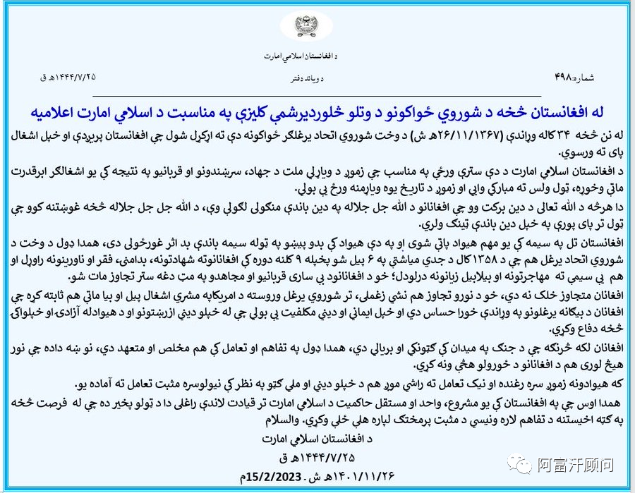 2月15日,正值苏联军队撤出阿富汗 34 周年纪念日之际,阿富汗伊斯兰酋长国(IEA)发表声明,呼吁与世界进行积极互动。