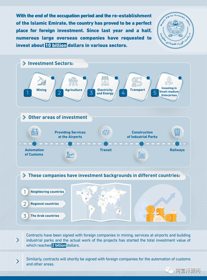 日前,据阿富汗经济副总理办公室报道,随着伊斯兰酋长国的重建,许多外国大公司都表示愿意在阿富汗投资共约100亿美元,一些公司已经开始实际工作。有关更多详细信息,请参阅下面的信息图。另外最近共批准24.8亿AFS项目。