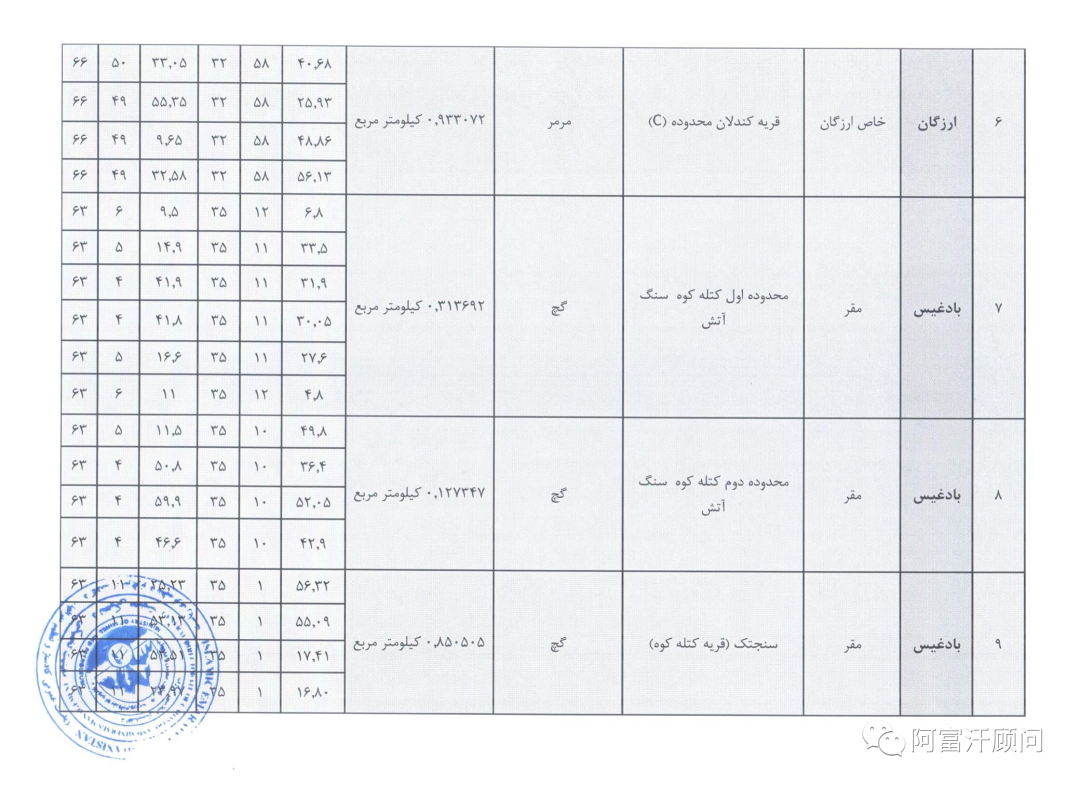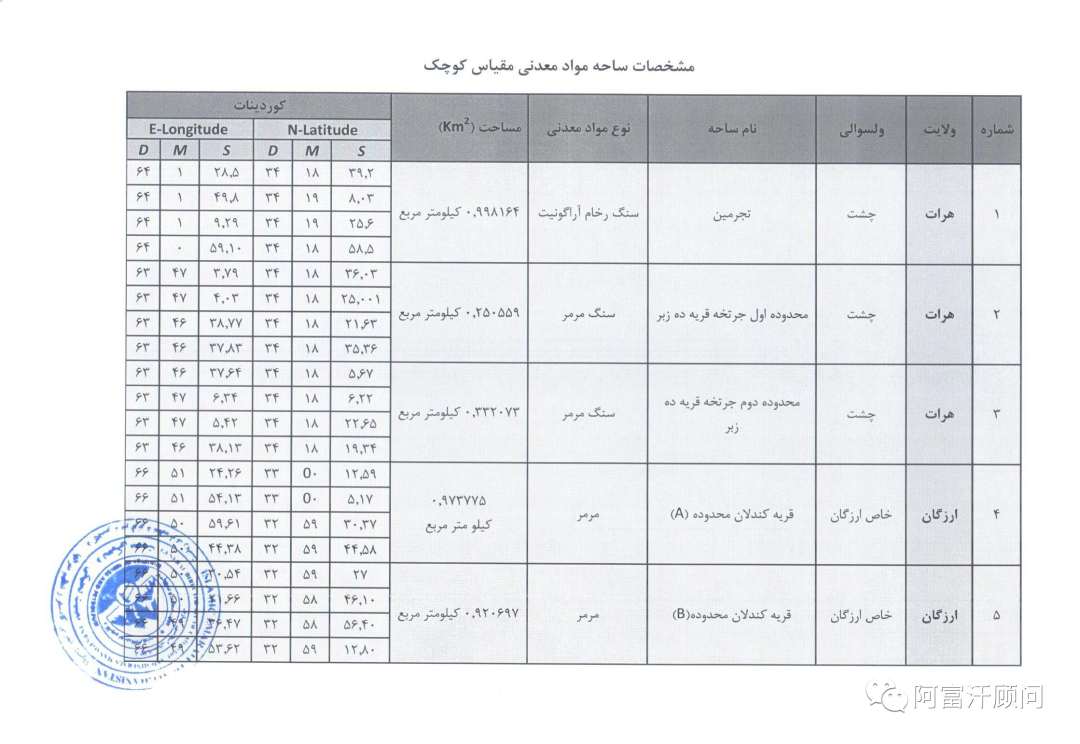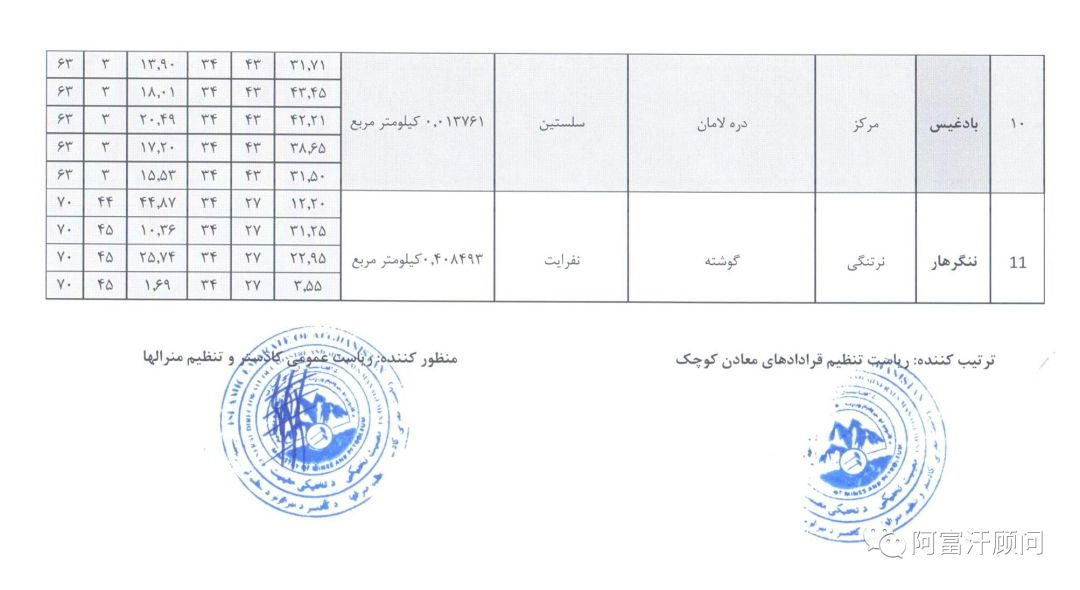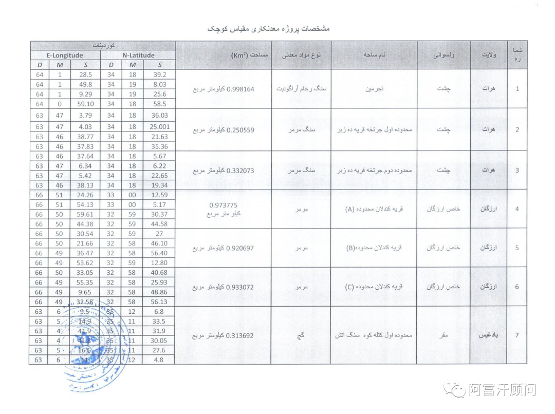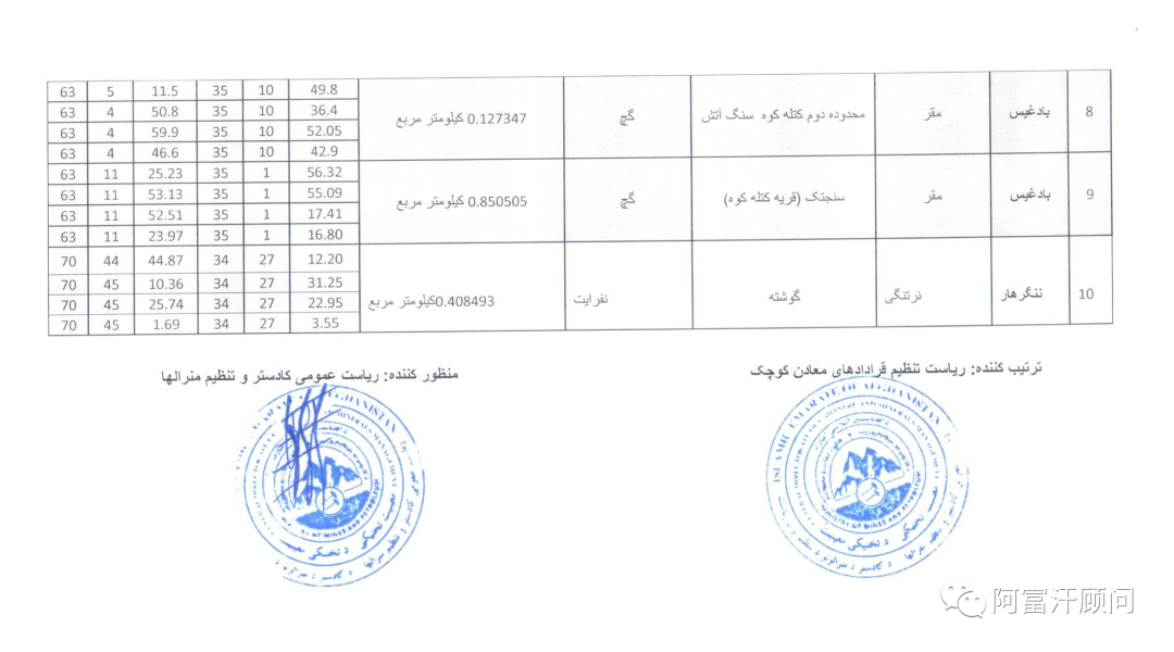 4月16日,阿富汗矿业和石油部将昨天公布的11个小规模矿山招标公告调整为10个,宣布位于赫拉特、巴德吉斯、楠格哈尔和乌鲁兹甘省的 (10) 个小型矿区招标,有兴趣的人可以在 1/27/1402 至 2/26/1402 期间向矿产监管总局提交申请。这是自4月8日发布12个小规模矿业招标后又放出来10个小型矿山项目,显示出阿富汗当局正在加快经济发展项目推进。有意向的投资人可以联系阿富汗顾问咨询具体项目细节。