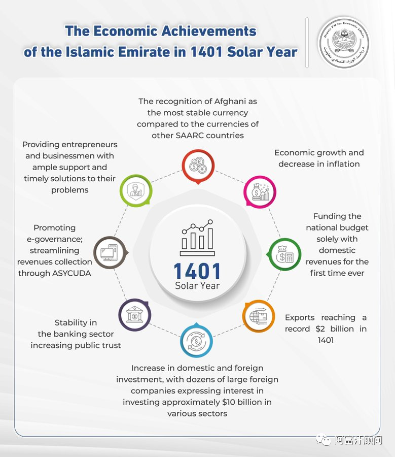 5月9日,阿富汗当局(伊斯兰酋长国)经济委员会表示,1401年在经济领域取得了丰硕的成果,政府在各个领域都取得了良好的成绩。当局总结的1401年政府的主要经济成就如下图。