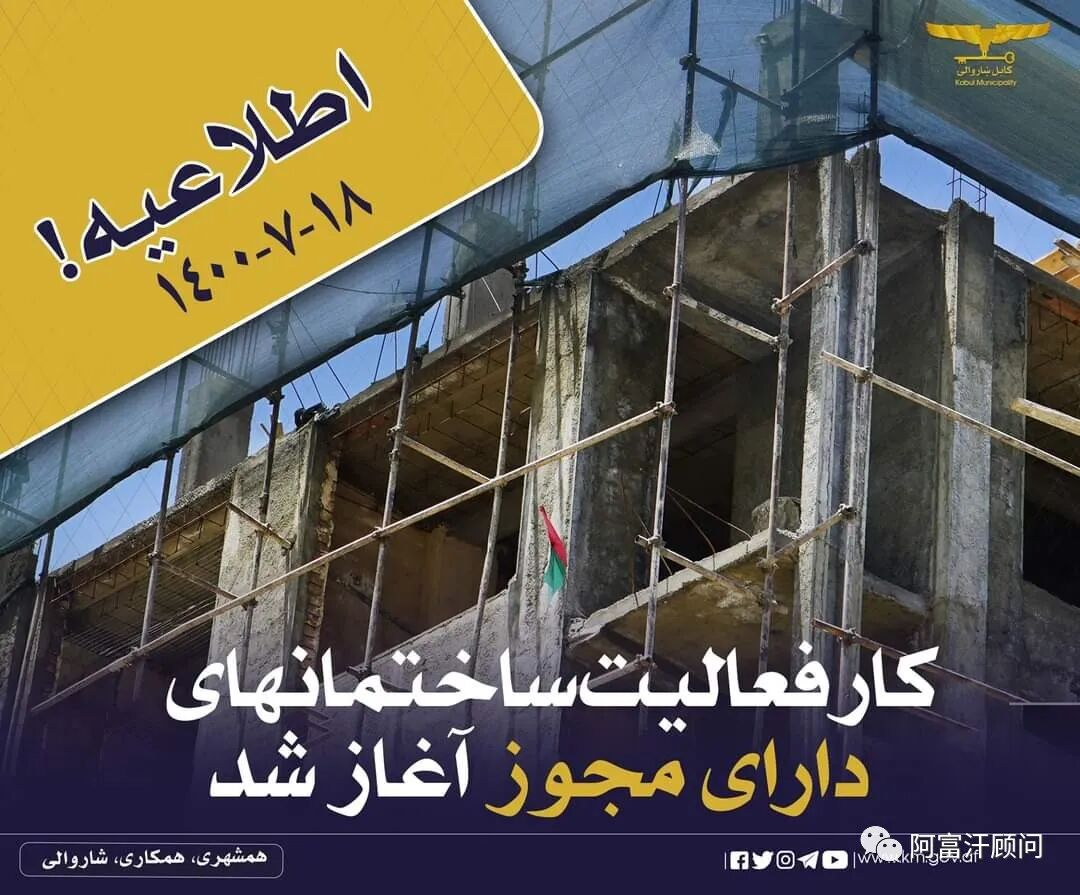 今日,喀布尔市政府发布公告,持有建筑许可证并符合要求的公民可以重新开始建造建筑物。在阿富汗伊斯兰酋长国内阁会议上,由第一副总理毛拉.阿卜杜勒.加尼.巴拉达主持,作出这一决定,以便已经从喀布尔市政府获得在规划区内建设许可证的公民,以及由于某种原因停工的,可以重新开始建造他们的建筑。非规划区域的建筑活动将被排除在此范围之外,违者将受到法律的严肃处理。为市民改善城市建设状况,规划区内颁发建设许可证程序是简单易行的机制。防止喀布尔市的违章建筑是目前最重要的城市问题之一,除了发展不平衡和无计划,这个问题本身也造成了其他城市问题,如不安全、过度拥挤和造成城市交通拥堵、环境扰动、对建筑周边的非法侵犯等等挑战和问题。