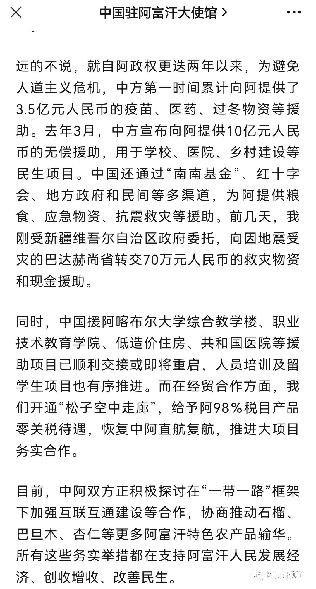 今天(8月30日)驻阿富汗使馆临时代办赵海涵接受《环球时报》专访,谈到了中国援助阿富汗话题。