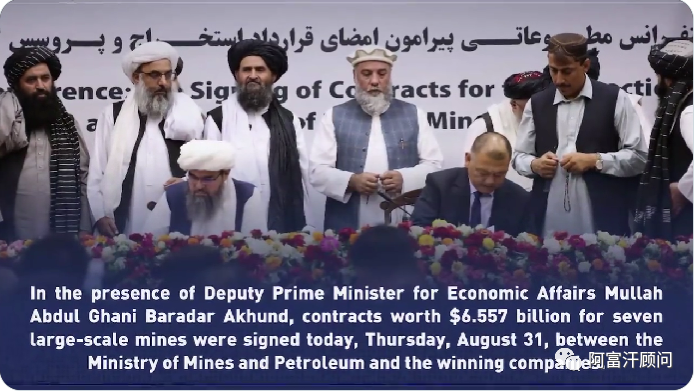 阿富汗第一副总理官方推特和阿富汗矿业和石油部公告,今天 8 月 31 日星期四,在主管经济事务的副总理毛拉·阿卜杜勒·加尼·巴拉达尔·阿洪德 (Mullah Abdul Ghani Baradar Akhund) 的见证下,矿业和石油部与中标公司签署了价值 65.57 亿美元的七个大型矿山合同。