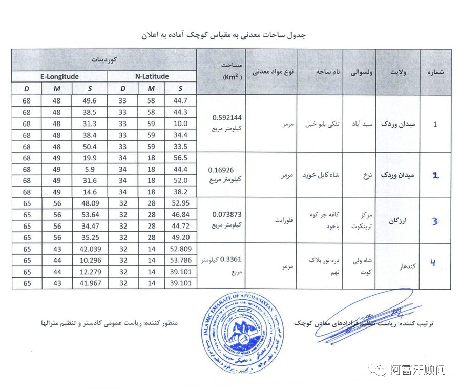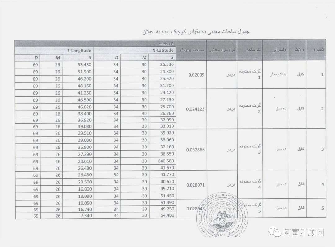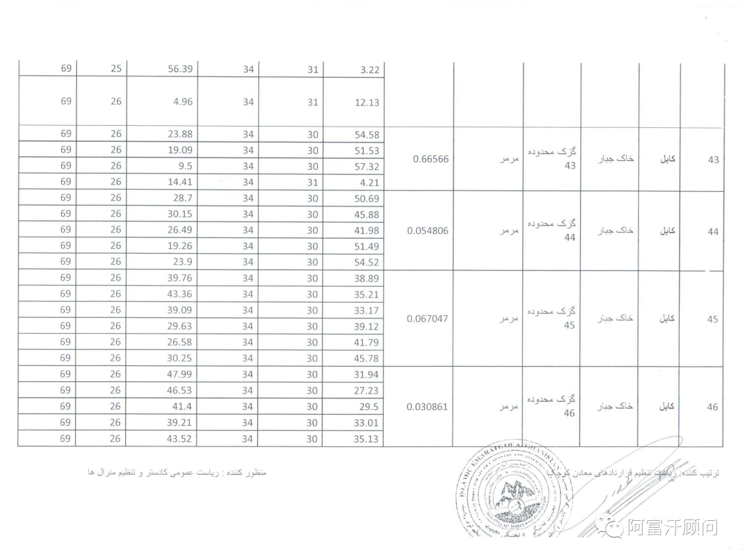 9月11日,阿富汗矿业和石油部更是一次性宣布46个新的小型采矿项目招标,其中包括喀布尔省Deh Sabz区Gazak地区和Khakjabar区新建46个小型大理石开采项目。申请人可以于1402年6月21日至1402年7月19日向矿产监管总局提交申请。购买招标文件的价格为37500阿富汗尼(不可退还)。