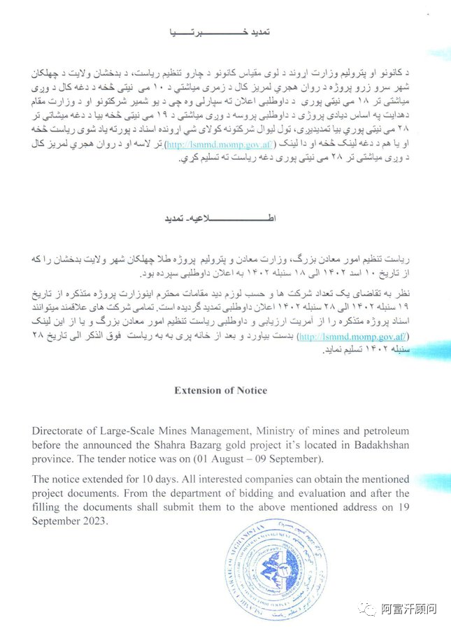 9月11日,矿业和石油部大型矿山管理局宣布,位于巴达赫尚省Shahra Bazarg 金矿项目招标。招标公告发布日期为(8月1日至9月9日)。该通知延长了10天。所有感兴趣的公司均可获取上述项目文件。招标评标部门填写完毕后,于2023年9月19日送至上述地址。