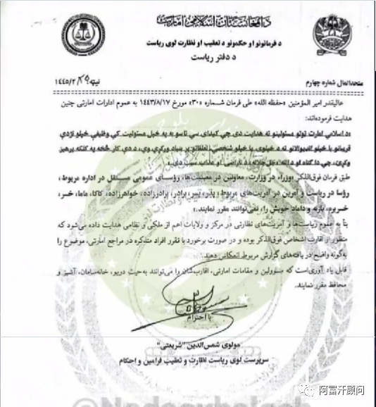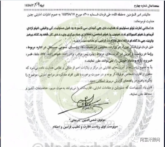 昨天,阿富汗当局官方媒体RTA视频公布了较早前阿富汗塔利班领袖的一份法令照片,根据领袖的这份法令,各部委和独立机构的官员不能任命其近亲担任政府职务。阿富汗顾问注意到,此次公布的领袖签字与较早前阿富汗国防部公布的一份据信是领袖批准的文件上签字有所不同。(参见较早前本公众号文章)