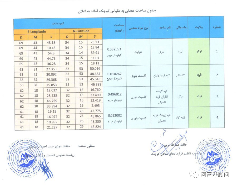 今日,矿业和石油部重新公布了洛加尔省和法拉省的四个小型采矿项目招标:方解石、软玉(阿富汗玉),其规格如下表所示,供有关各方参考。申请人可以于1402年7月11日至1402年8月10日向矿产监管总局提交申请。支付37500阿富汗尼(不可退还),即可获得必要的文件。