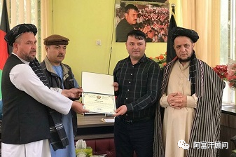 阿富汗北部巴格兰省议会给北方煤炭局局长和古里水泥局代理局长Riazudin Sharifi发奖状,感谢他的努力和诚实的辛勤工作。