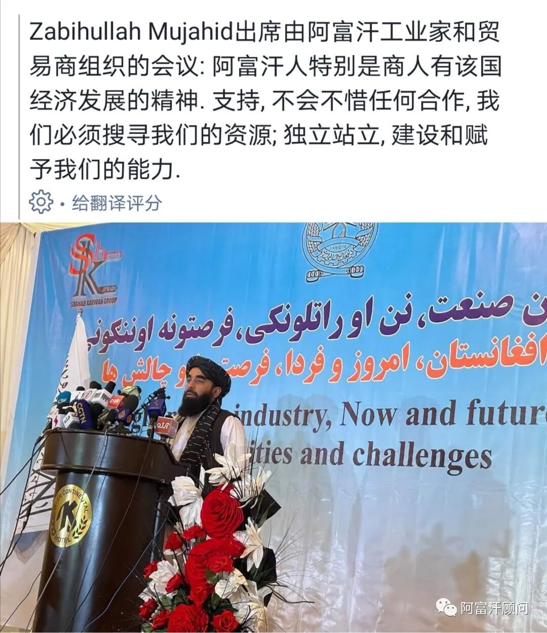阿富汗信息和文化部副部长、阿富汗新政权第一发言人扎比胡拉·穆贾希德出席阿富汗工商会组织的会议,他表示:支持阿富汗人,特别是商人发展国家经济的士气,不会剥夺他们任何合作,我们需要寻找资源来独立自主,建设和加强我们的能力。