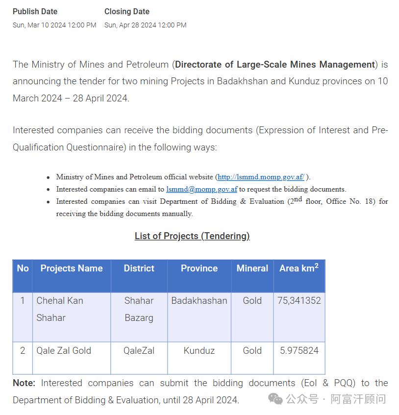 阿富汗铅锌矿招标提醒